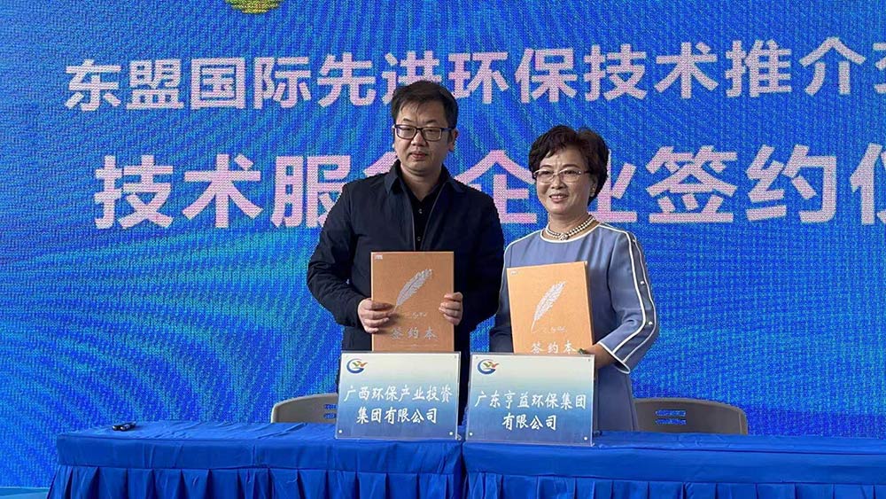 下午,承办方广西环保集团举行了技术服务项目签约仪式,广西环保集团常务副总经理王兵与广东 新爱体育 集团有限公司董事长张玲萍女士签署了技术服务项目协议。
